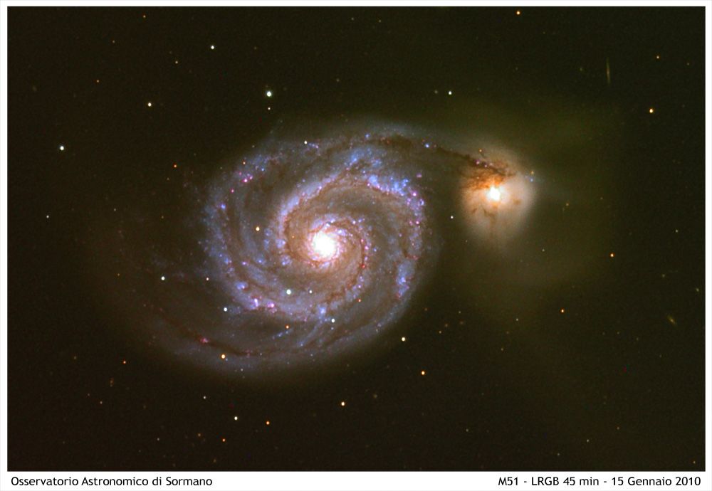 La galassia in primo piano, nota come Galassia Vortice, situata nella costellazione dei Cani da Caccia, usando un suo braccio come se fosse un artiglio, ha catturato, con la sua forza gravitazionale, una galassia più piccola che non ha più scampo.