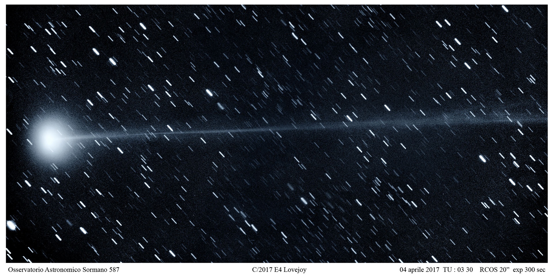 Nel suo avvicinamento al Sole i primi giorni di aprile ha avuto un improvviso aumento di luminosità guadagnando circa 4 magnitudini portandosi al limite della visibilità ad occhio nudo. Non potevamo lasciarci scappare l’occasione di fotografarla con la sua lunga e sottilissima coda nonostante occorresse fare una levataccia in quanto visibile poco prima del sorgere del Sole nella costellazione di Pegaso.