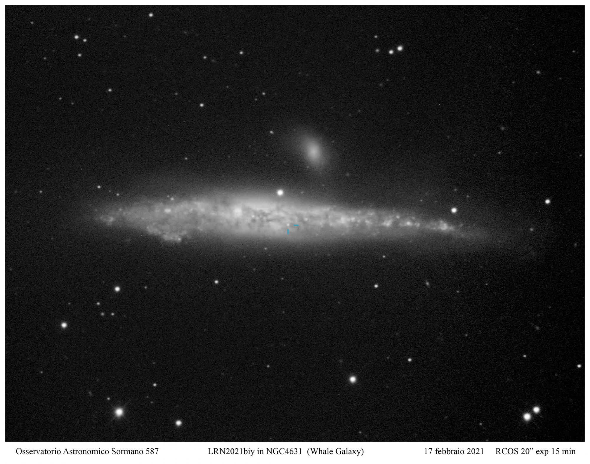La galassia in cui è situata è NGC 4631, anche conosciuta come Galassia Balena per via della sua forma leggermente distorta che le conferisce un aspetto simile al cetaceo, ed è situata nella costellazione dei Cani da Caccia. Si tratta di una galassia a spirale barrata, di magnitudine +9,3, osservata per la prima volta da William Herschel nel 1787 assieme alla piccola galassia satellite NGC 4627, visibile nella nostra immagine poco più in alto. Esse fanno parte di un ‘Gruppo Locale’ simile al nostro, di cui tuttavia risulta difficile trovare il numero esatto di componenti, al momento stimato tra 5 e 27: solamente altre due galassie poco lontane (NGC 4656 e NGC 4657) sono infatti visibili con telescopio.